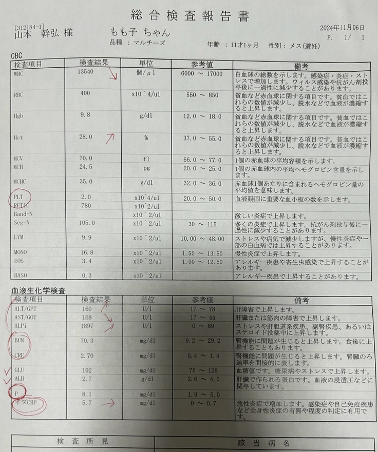 長期の点滴により炎症数値が上昇してしまったことや、腎臓の数値が中々下がらず、入院室ではお水を飲まず排泄をしないことにより、自宅療養になりました。