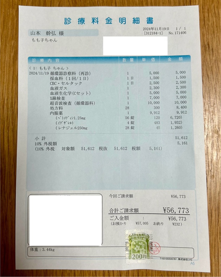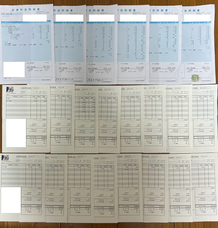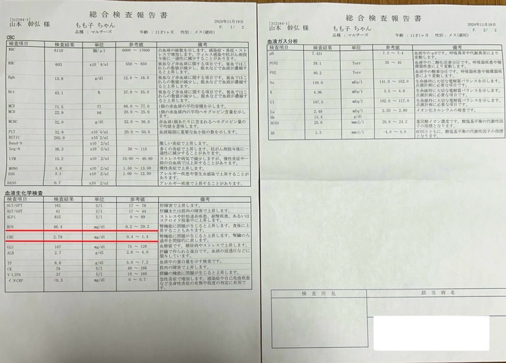 血栓や貧血、炎症の数値などは正常値の範囲に収まってきています。腎臓の数値CRE、BUNだけが高く、皮下点滴はまだ続けなければなりません。
