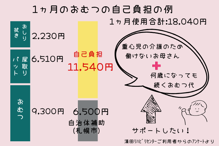 札幌市では障がい児の家庭に毎月6,500円のおむつ補助がありますが、実際に必要な費用は月約18,000円。毎月約11,500円が自己負担となり、家計を圧迫しています。