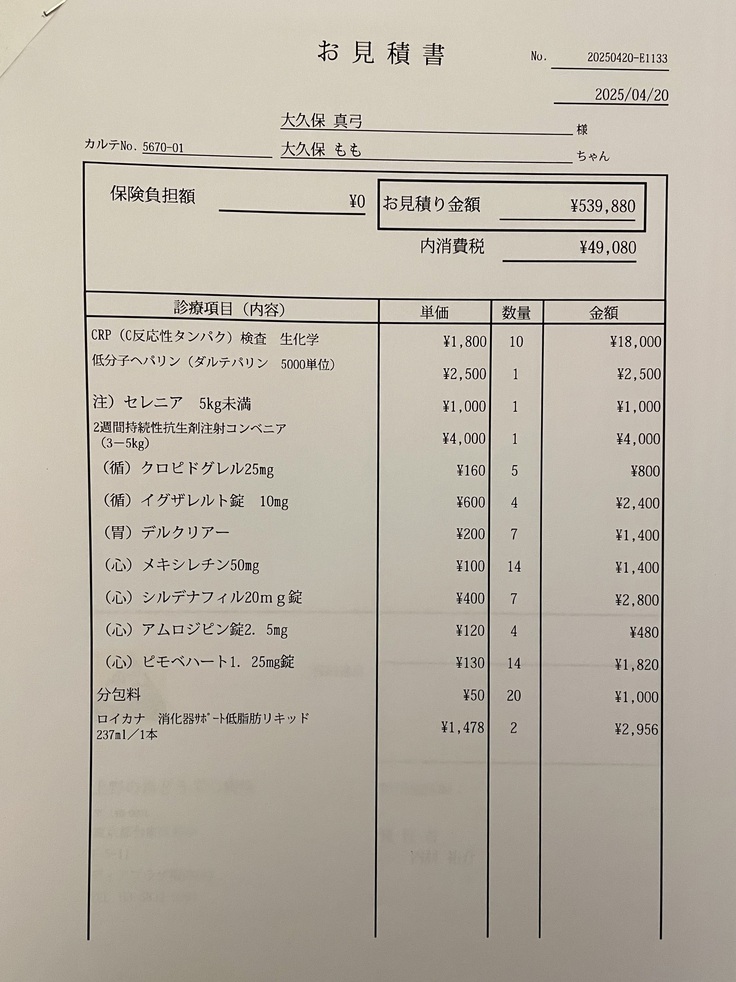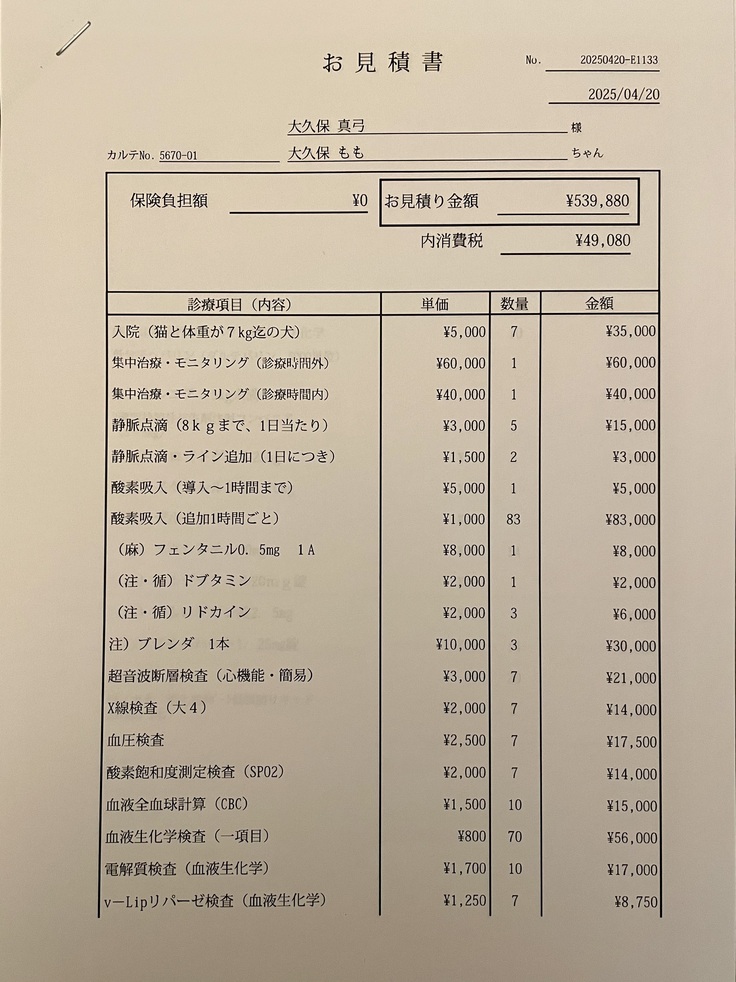 本来であれば、飼い主である私が費用を全額負担するのが当然であることは、重々承知しております。