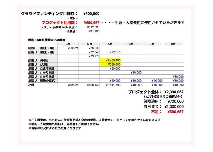 至急の手術が必要なため、不足分は借入などで対応いたします。