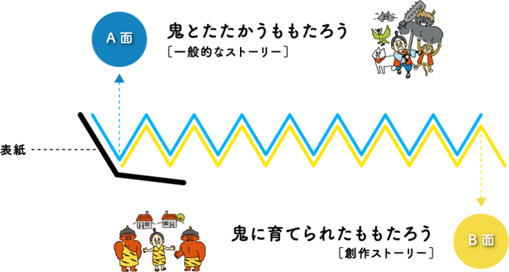 この絵本は、一般的なももたろうと、ももが島に流れ着き、鬼に育てられたもう一人のももたろうの、異なる主人公の2つのお話が、特殊な製本手法により1冊の本にはいっているユニークな絵本です。