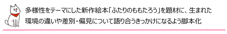 そんな考えが背景にあり、絵本「ふたりのももたろう」はぴったりの題材でした。違う立場になって考える」という絵本のテーマを受け継ぎ、生まれた環境の違いや差別・偏見について語り合うきっかけとなる作品に仕上げたいと考えています。