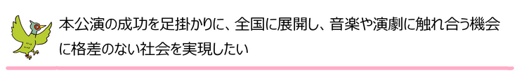 このプロジェクトが目指すのは、音楽や演劇に触れ合う機会に格差のない社会の実現と、地域の困難を抱えるご家庭への手助けとなることによる地域社会への貢献です。