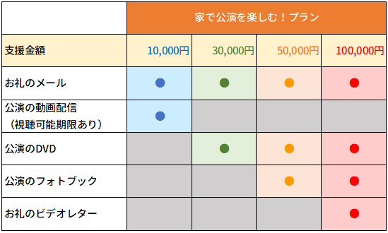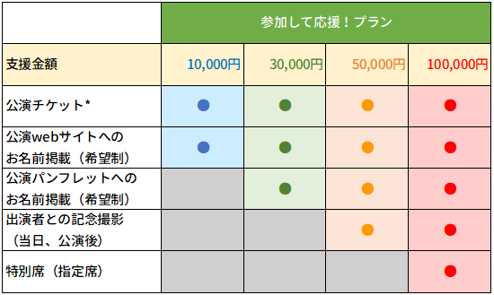 なお、これまで設定していた【参加して応援】の公演チケット付きリターンについては販売停止とし、今後は、延期後の公演のチケット付きリターンとして販売させていただきます(ご参加日程は別途調整)。