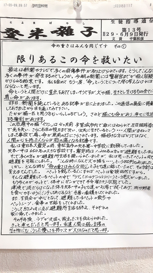 『命というと人間だけに焦点をあててしまいそうですが、犬、猫、生きとし生けるもの全てに尊い命があります』