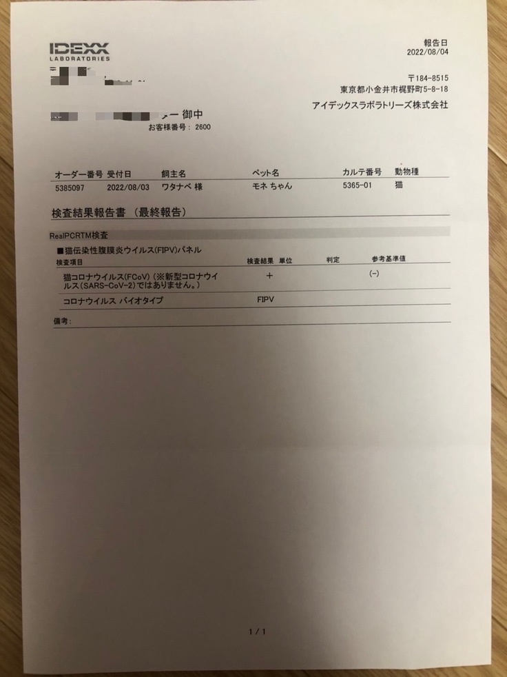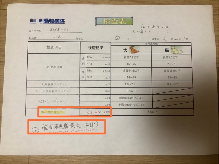 血液検査の結果と症状からFIPの可能性が高いとのことでした。