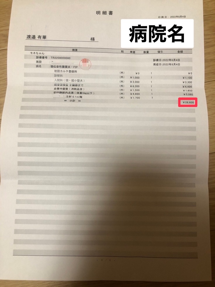 その時医師から、「炎症の値がとても高く、症状をみる限りFIPの可能性が高いと思います、数日の命かもしれません、覚悟してください」と告げられました。