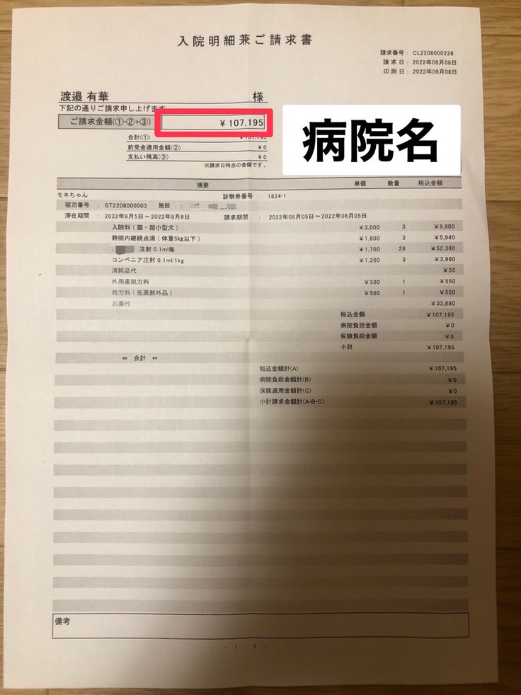 入院費は3,300円/日、薬代(注射)は13,090円/日でした。