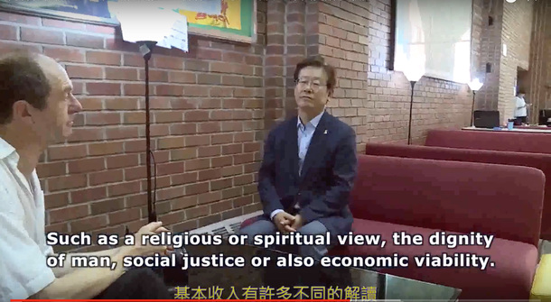 この映画に出演してくれている、スイスのベーシックインカムのリーダー、エノ・シュミットさんが、韓国の大統領選挙に出馬していた前城南市長の李在明氏へのインタビューを2015年に行なっています。李在明さんは、韓国で初めて、ベーシックインカム実験を城南市で実現した市長です。韓国のトランプ、と紹介されることもありますが、その政策を見ていくと、むしろ韓国のバーニー・サンダースではないでしょうか。