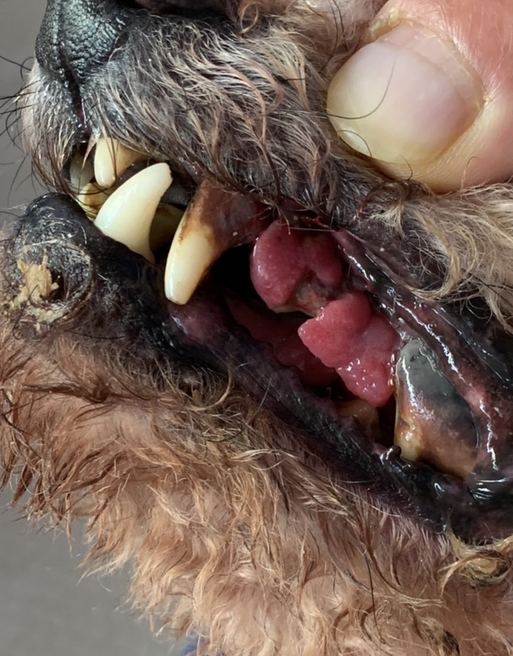 口腔内にいる 灰色の陰(鼻の骨の方に広がっています)