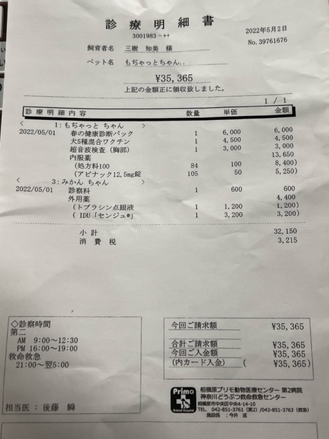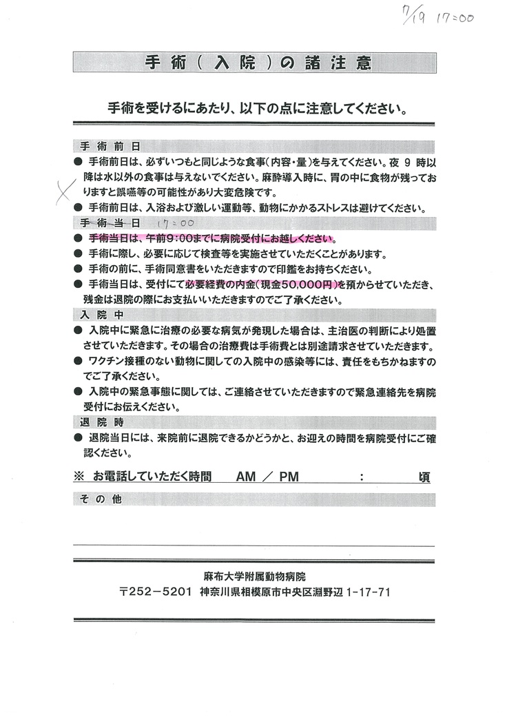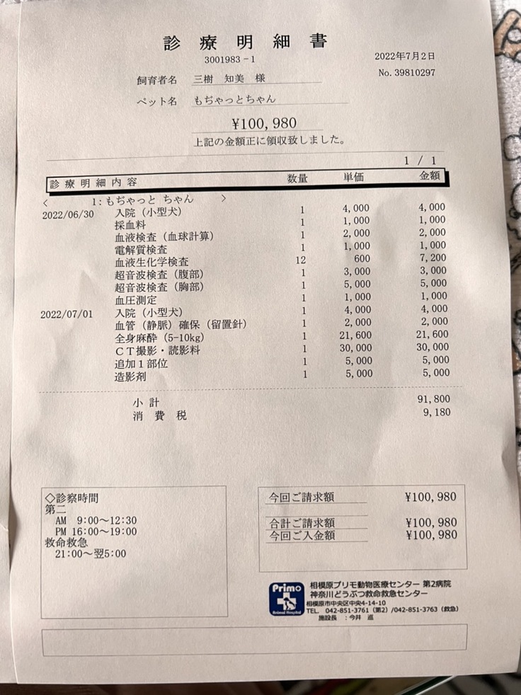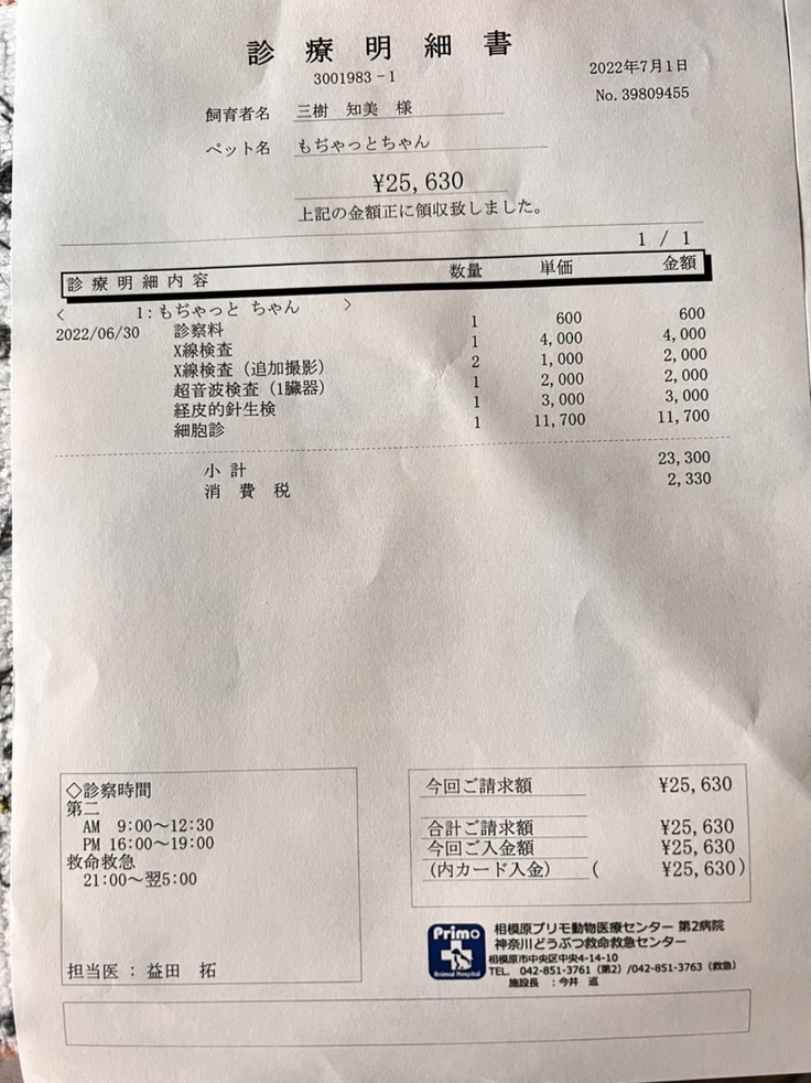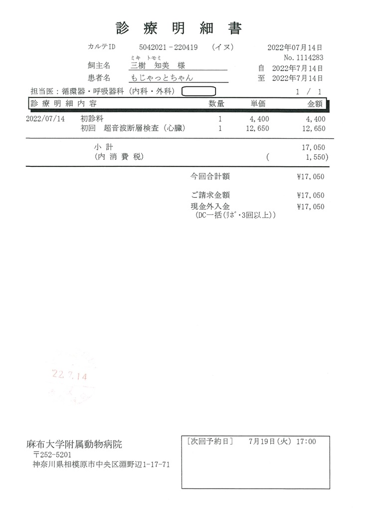 7/14 39,650円 (精査検査) 麻布大学附属病院