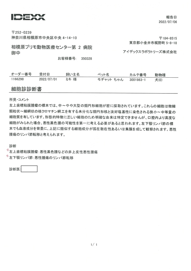 掲載許可は頂いておりますが 診断医の名前は控えて頂きたいとのことですので