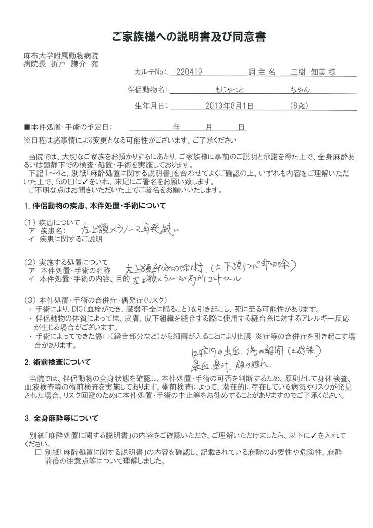 「メラノーマは質の悪い癌ですが、もぢゃっとくんの見える病巣はそんなに悪い顔つき(*1)じゃないです。 この子はまだ 頑張れる年齢だし 寿命を少しでも延ばすために最大限の努力をして手術を行います」