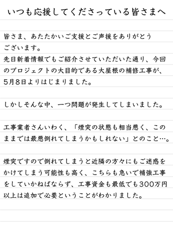 後残り一週間ですが新たに問題がでてきました。煙突が危険な状態とのことです。