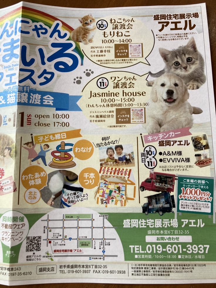 5月10日(土)は盛岡住宅展示場アエルさんでも初の譲渡会です!