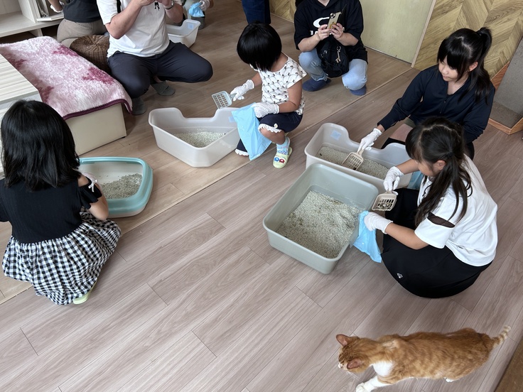 小学生のお子さまたちを対象に、トイレのお掃除やねこのブラッシング、おやつタイムを体験していただきました。