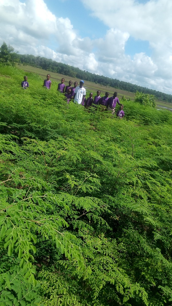 今年4月に設立しました5ヶ所の小学校でのモリンガ・スクールガーデンですが、その後も地元NGOの指導・モニタリングのもとで、先生と生徒たちが草引き、水遣りそして家畜侵入防止のフェンス作りを行い、7月現在モリンガと野菜はスクスクと成長しています。収穫されたモリンガ葉と野菜は、一部試験的に学校給食に取り入れられました。