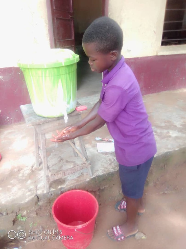 子どもたちが手洗いの習慣を身につけていく活動も行っています。水の浄化作用を持つモリンガの種を、ここでも活用しています。