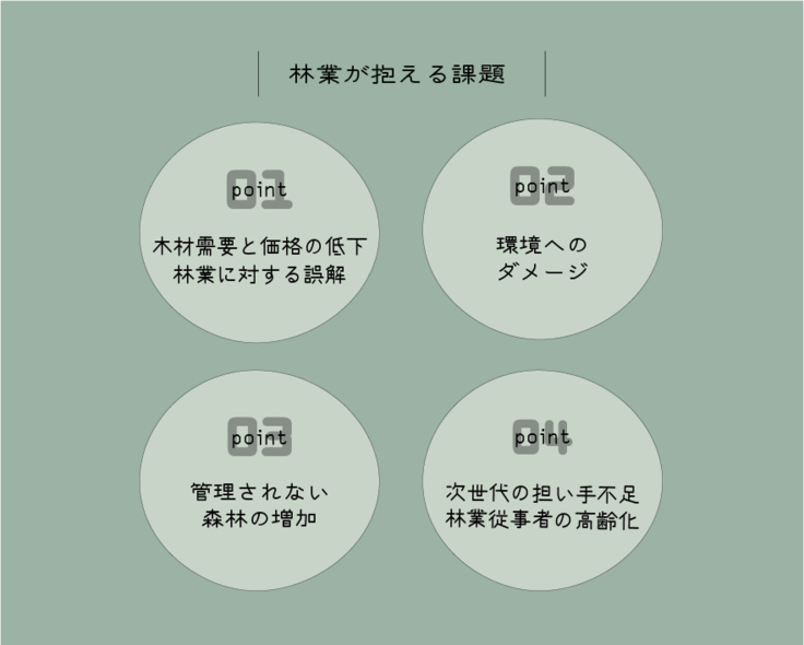 不要な木を伐採することで、森に光を与え、持続可能で元気な森を育て、生態系の保全機能を保っています。私たちが日々安心して暮らせるのは、林業の方々が森を管理してくださっているから。しかしながら、林業は多くの課題を抱えています。実際に林業や森のことを知らないままに誤ったイメージが先行し、実態とはかけ離れた言葉で語られてしまうことも多いのが現状です。