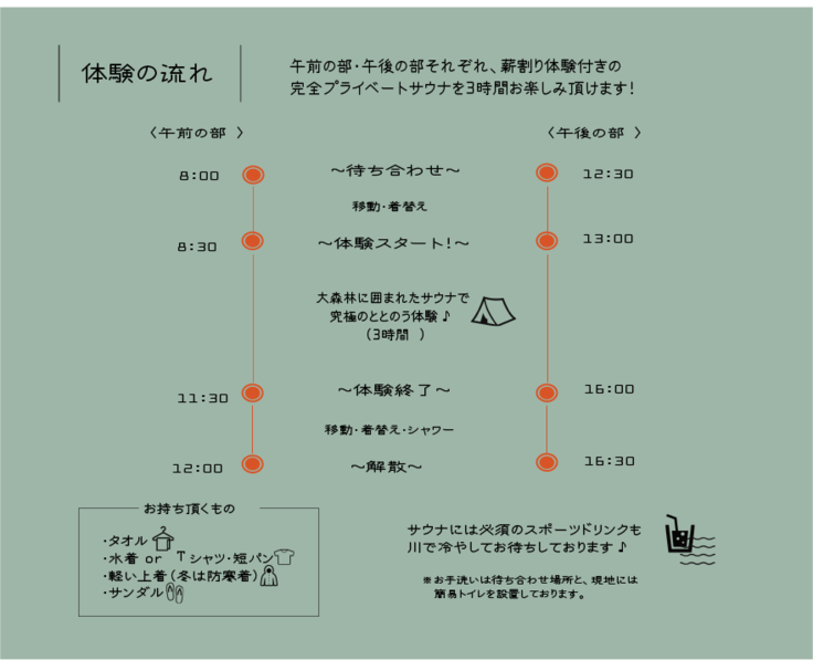 人目を気にせず、自然の中で楽しむサウナは格別です。