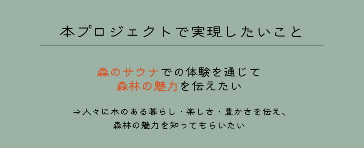 本PJを通じて一人でも多くの方に林業や森林への興味や正しい知識、そして何よりも森の魅力を感じて頂き林業の魅力や真の価値をお伝えしたいです。