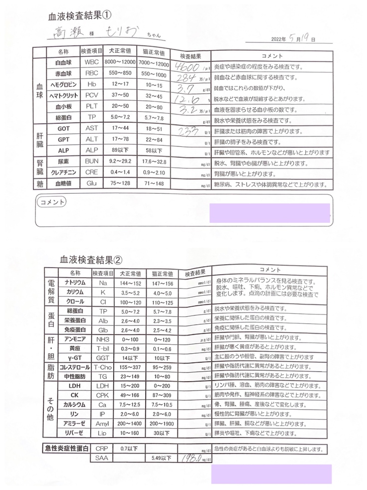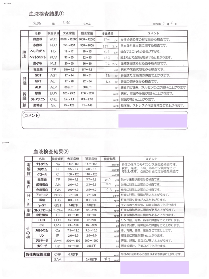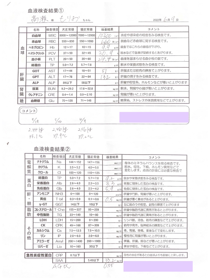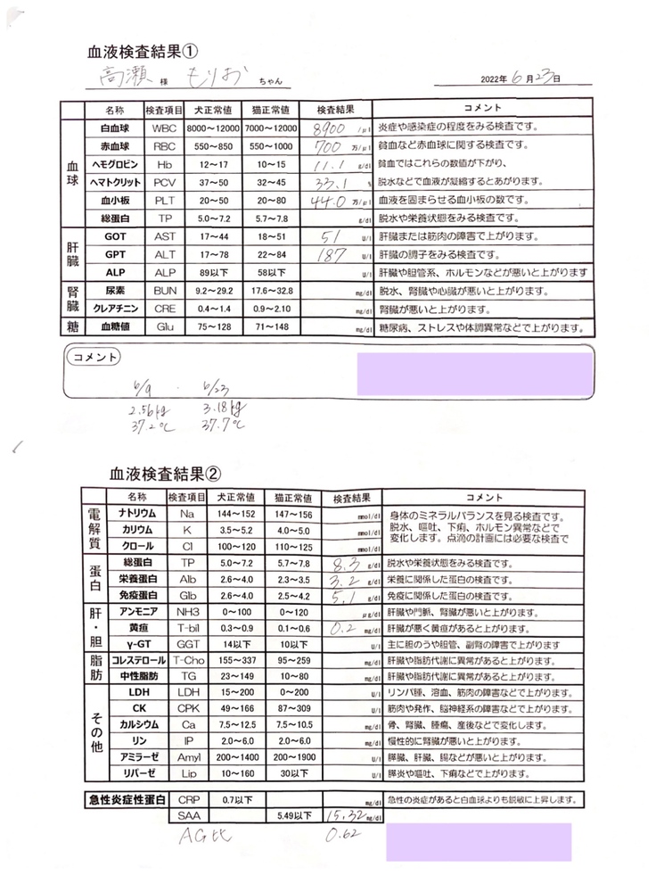 協力病院にて検査をしてもらった所、19日の血液検査よりも良くはなっているが貧血や肝臓、炎症等の数値が悪いとの事。
