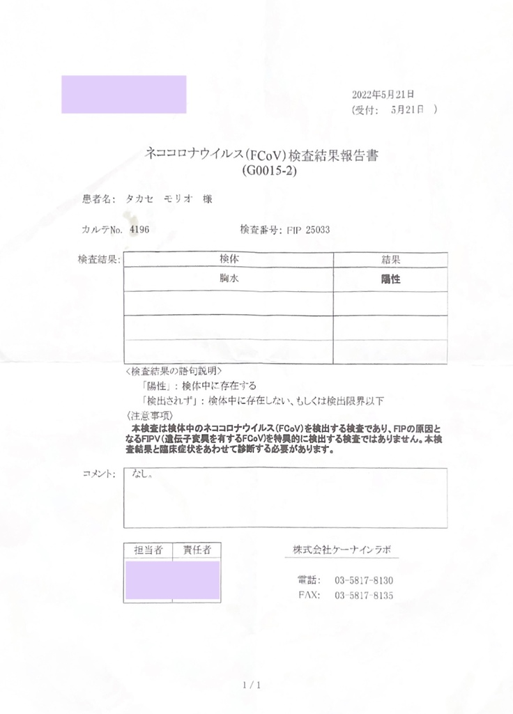 地元病院から、FIPの検査結果が出てやはりFIP陽性だったと伝えられました。