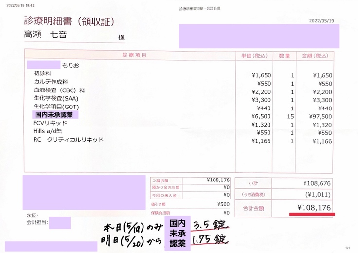 ・5/19(木) 協力病院にて検査と国内未承認薬(7日分)を処方して頂きました ¥108,176