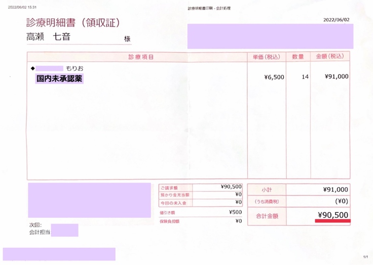 ・6/2(木) 協力病院にて国内未承認薬(7日分)を処方して頂きました ¥90,500