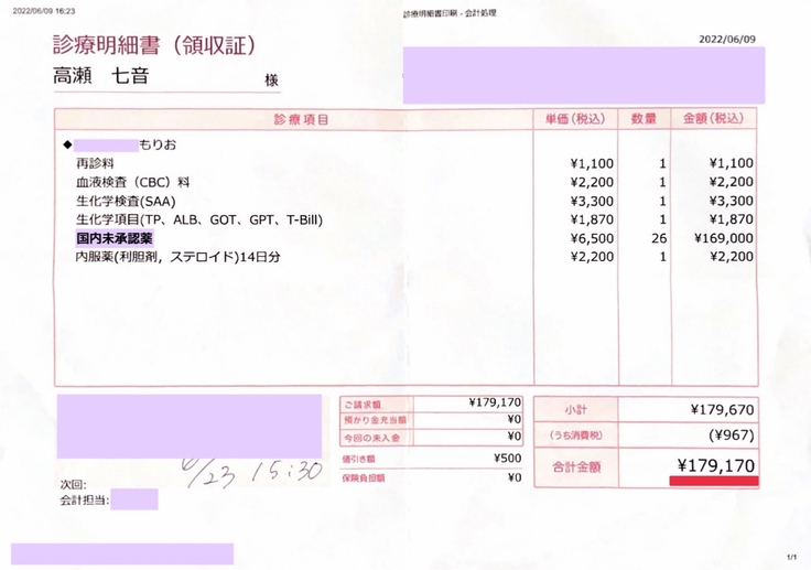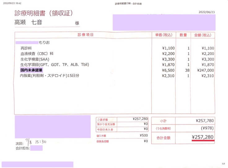 ・6/23(木) 協力病院にて検査と国内未承認薬(15日分)とステロイド(15日分)と利胆剤(15日分)を処方して頂きました ¥257,280