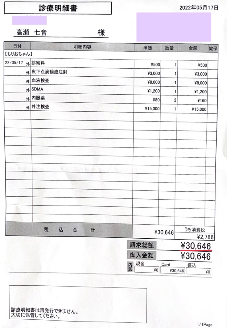 ・5/17(火) 地元病院にて検査と点滴をして頂きました ¥30,646