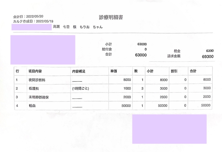 ・5/20(金) 夜間の動物病院にて輸血をしていただきました ¥69,300