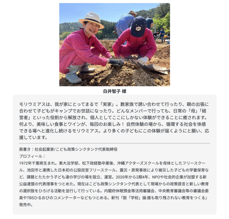 お母さんとは一昨年から始めたモリウミアスファームでの、土づくりやぶどうの植樹まで農園主として一緒に場を育んでいただいています。いつも満面の笑みで、このぶどうでワインがつくられる日を楽しみにしながら。白井家の故郷としてあり続けたいなと思っています。