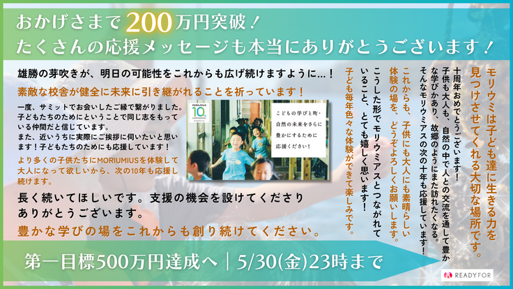 まずは500万円の達成にむけて、私たちも精一杯頑張りますので、ご支援や拡散などで応援いただけますと嬉しいです!