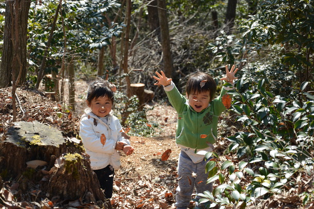 未就園の親子組の子どもたちがポカポカ陽気の中、落ち葉で楽しそうに遊ぶ