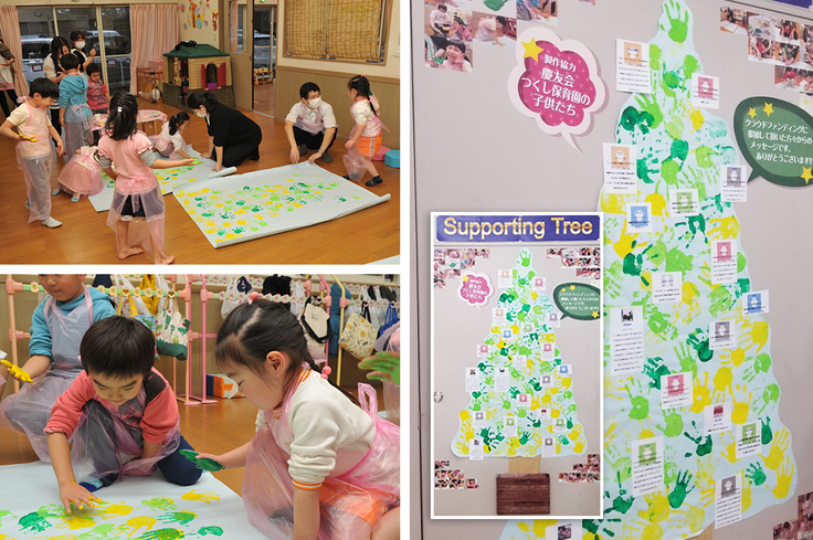 今回はみなさんからの温かいメッセ-ジを院内に掲示させていただくということでお礼の気持ちを込めて、子ども達と一緒にハンドスタンプでツリーの製作を行いました。