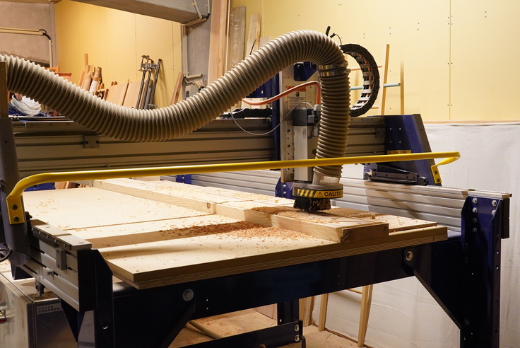 ウィーーーーンという音とともに3D加工機が動き出し、データの指示通りにずれなく、木材を切ったり、穴を開けたり。