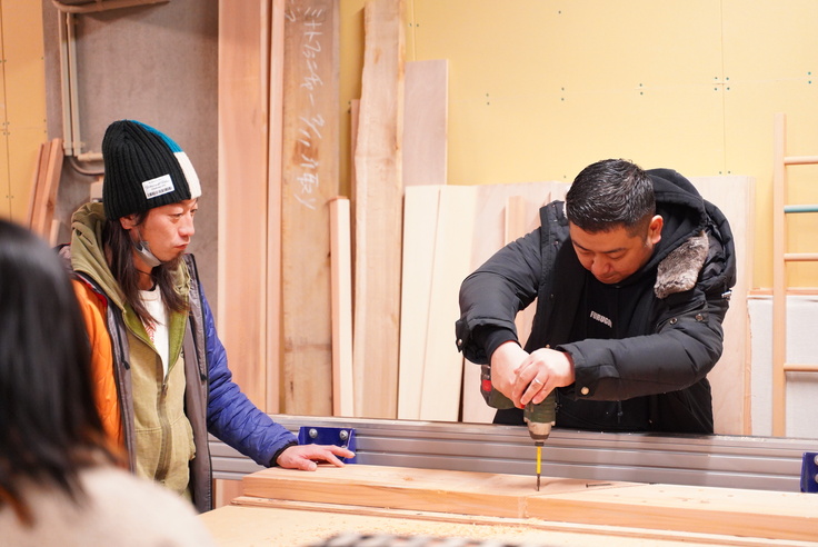 大工の須藤さんのサポートのもと、ShopBotの台の上に木材をセット。