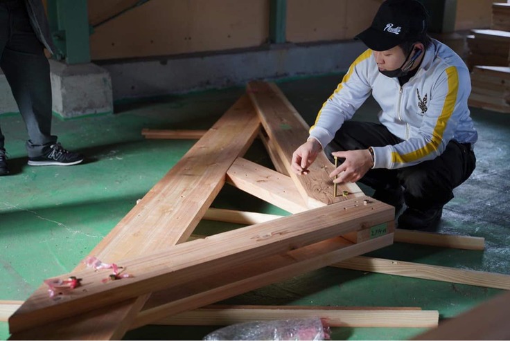 大工さん達にお手本を一つつくっていただき、手順を学んだ後に、いよいよ組み立てスタート!