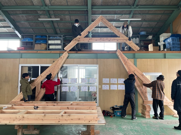 今回のワークショップでは、住宅の「壁パネル」と「登り梁」を制作。