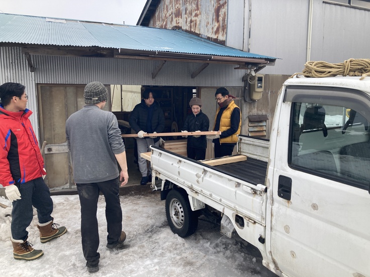 まずは、ShopBotで加工を行った「KILTA能代」と、五城目町のクリエイティブな木工所「佐藤木材容器」の2箇所から、加工した木材をせっせと運び出します。