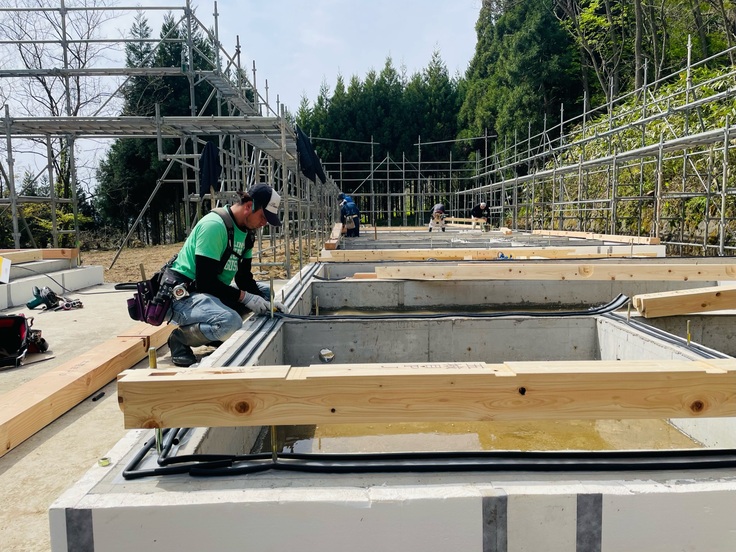 (写真)パネルを建てる土台をつくる「床組」作業の様子