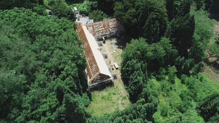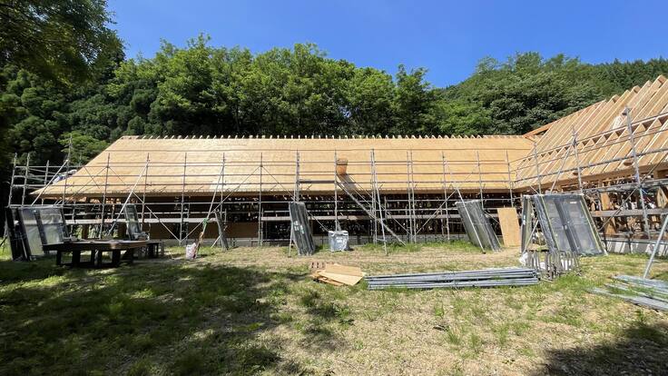 屋根の板や外壁を取り付ける作業も佳境を迎え、屋内空間は雨に濡れない状態になってきました。いよいよ完成までラストスパートです。