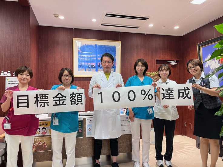 森山脳神経センター病院の眼科診療チームによる100%達成の記念写真です。忙しい診療の合間を縫って、支援者様へのお礼の気持ちと達成を祝う気持ちで記念写真を用意いたしました。