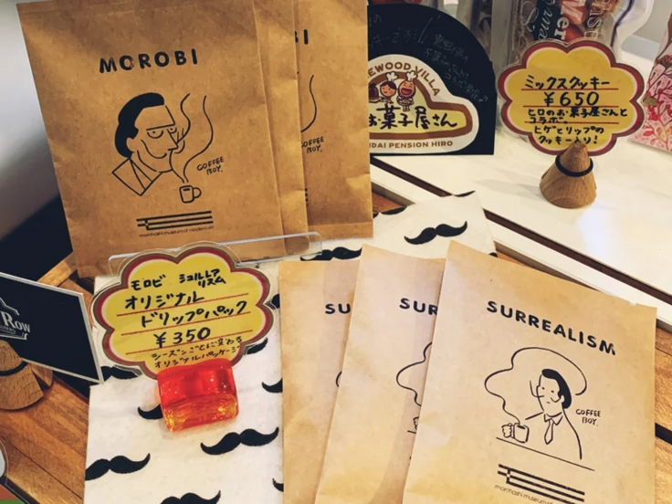「Rotten Row Coffee Roasters」さんのコーヒーは当館カフェでもご提供させていただいており、2種類の自家焙煎の美術館オリジナルブレンド「モロビ」「シュルレアリスム」はどちらも人気のメニューです。
