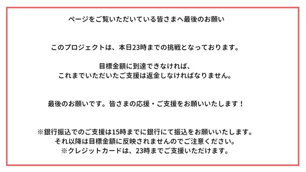 なお、本日ご支援いただく場合、銀行振込は午後の15時までにご入金をいただく必要がございます。15時以降はご支援が反映できませんのでよろしくお願いいたします。※クレジットカードは23時までご支援が可能です。