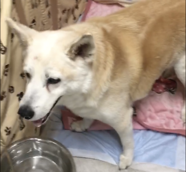 3月30日の夜、夜間動物要因で診療を受けた後。まだふらふらしながら歩くホワイト。だいぶ落ち着きを取り戻しました