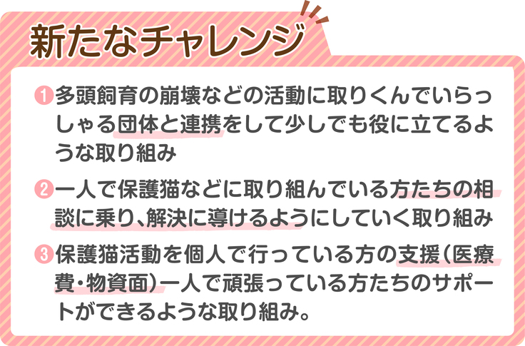 保護・飼育の意識・知識が高まり、一人が1頭でも責任感を持って保護できるようサポートの充実を目指し情報提供や啓蒙活動を更に行っていきたいと思っています。