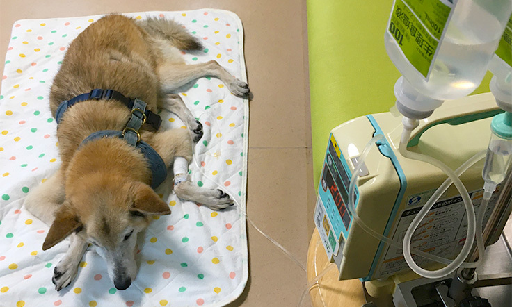 4月18日の夜に「チェリーのお腹が大きくなっている、早く動物病院へ行かないと胃捻転になる・・・」と夜間救急動物病院へ急行しました。